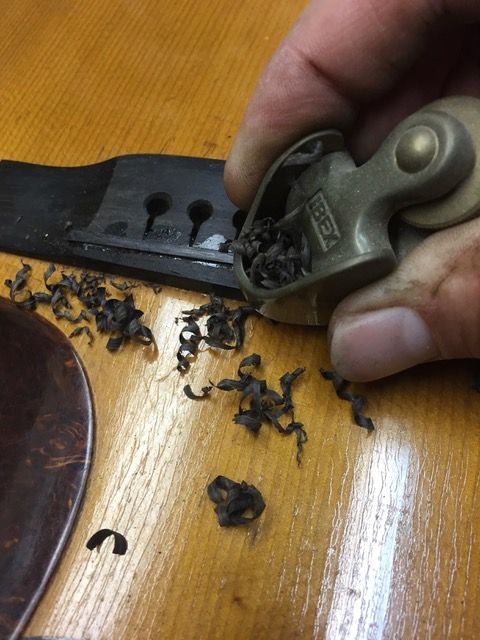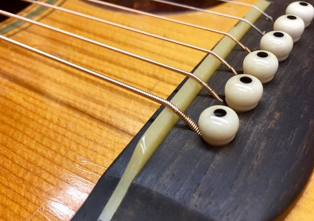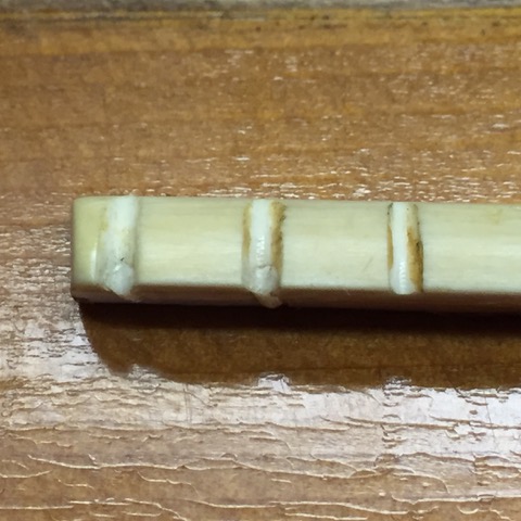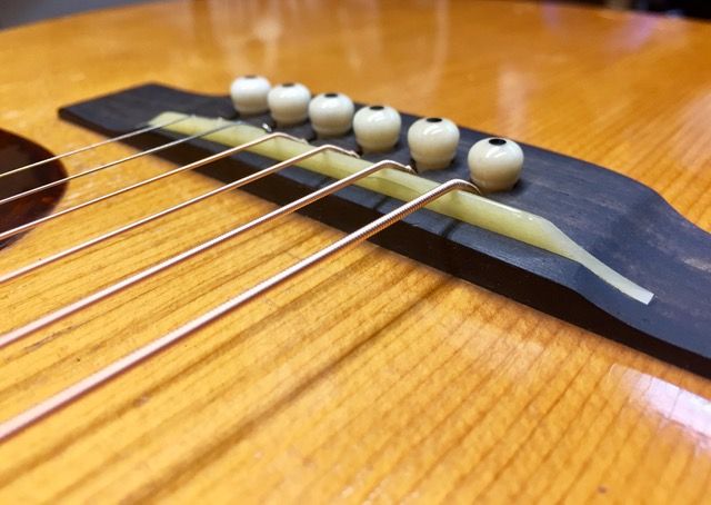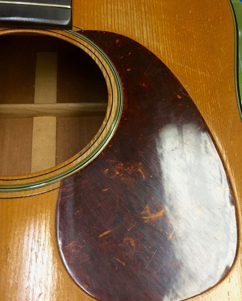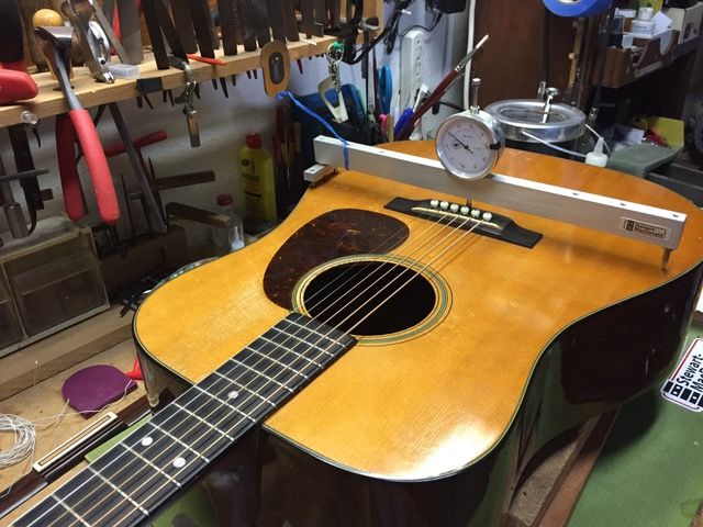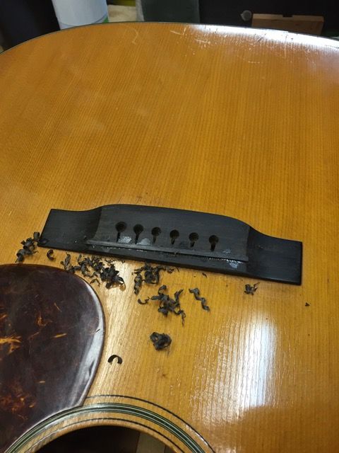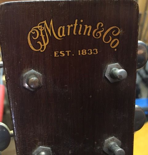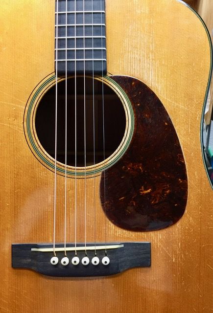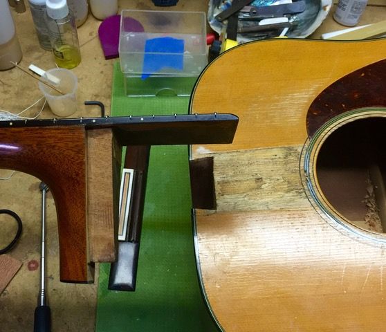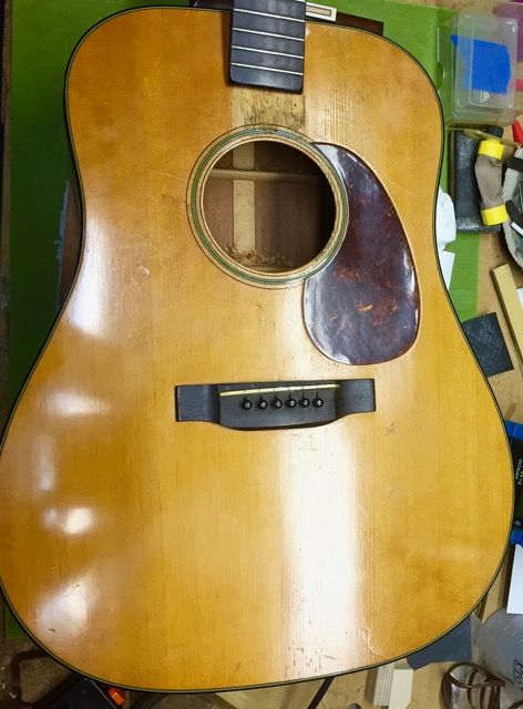 This beautiful 1946 Martin D-18 came to me with the neck already separated from the body. The neck had been professionally reshaped and refinished (except the headstock veneer) at least a dozen years earlier. The X brace was scalloped around this time too, a delicate procedure expertly executed on this instrument. The saddle was really far back making intonation very flat up the neck. I thought about replacing this original bridge to make the saddle location better and because this bridge top had been planed down. However, the bridge has never been off and the original footprint of the bridge was very clean. The thickness had been modified but not so much that the strength of the bridge area was compromised. I like to think of the bridge as a brace, just one that looks nice and is on the out side of the guitar. I filled the saddle slot and recut it as close to the front edge of the bridge as I dared. I reshaped the bridge top and added an unbleached through saddle. As a result the intonation has been greatly improved. I also reset the neck and refretted the guitar.